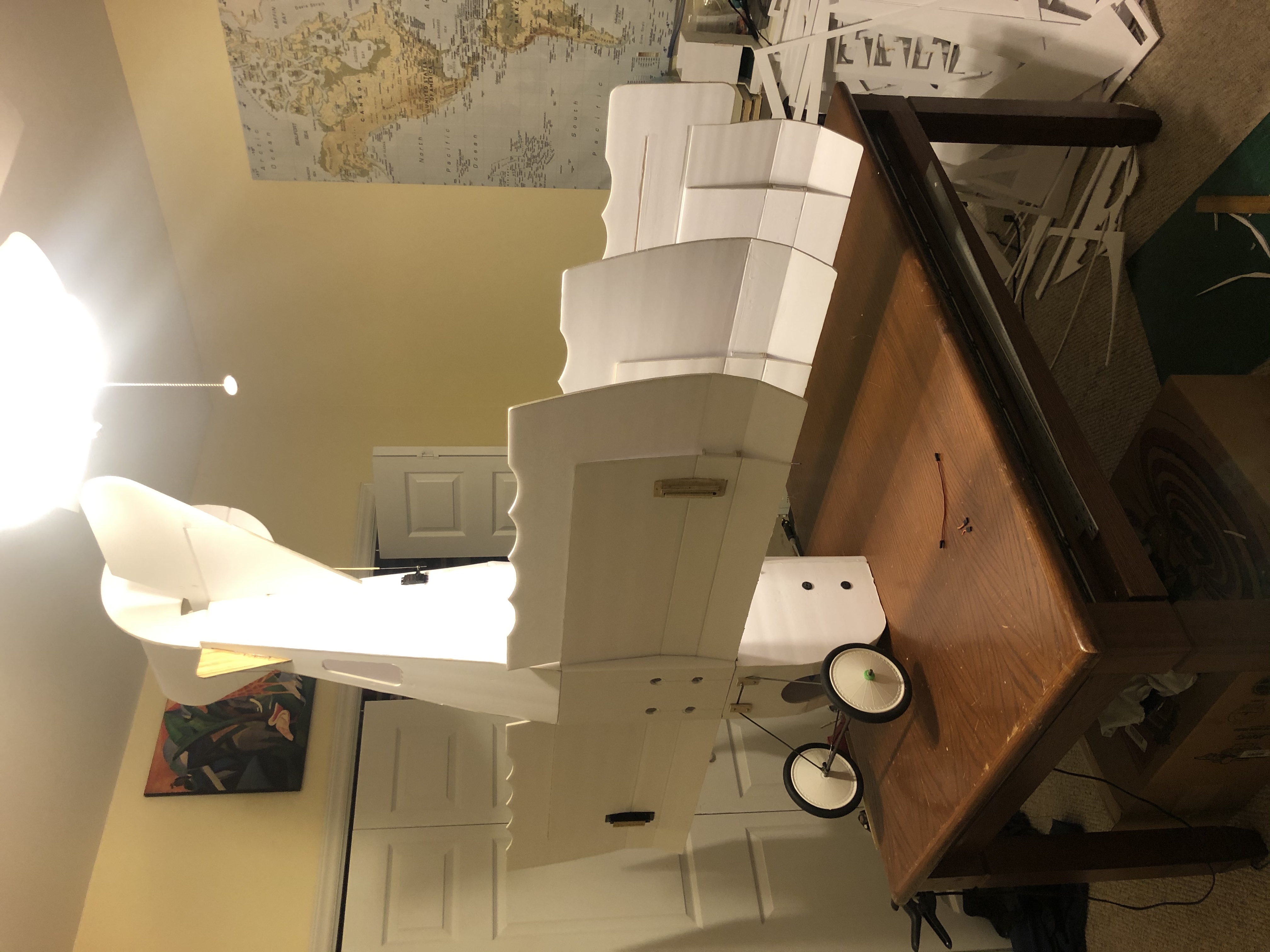 It was truly a “Mighty” Mini. I crashed it numerous times but it held out and to this day 3 years later it is still flying. I really enjoyed flying it but wanted to build a bigger one. So I enlarged the original 24” wingspan plans to 42” wingspan so now it took 6 sheets of foam instead of 2. The larger model had ailerons on the top wing. On the maiden flight it turned out it had major adverse yaw. I reconfigured the ailerons so they only had down movement about 1/4” and up movement about 1” as well as mixing in the rudder with the ailerons and using a bigger prop. This took care of the problem and now it flies very nice and slow.