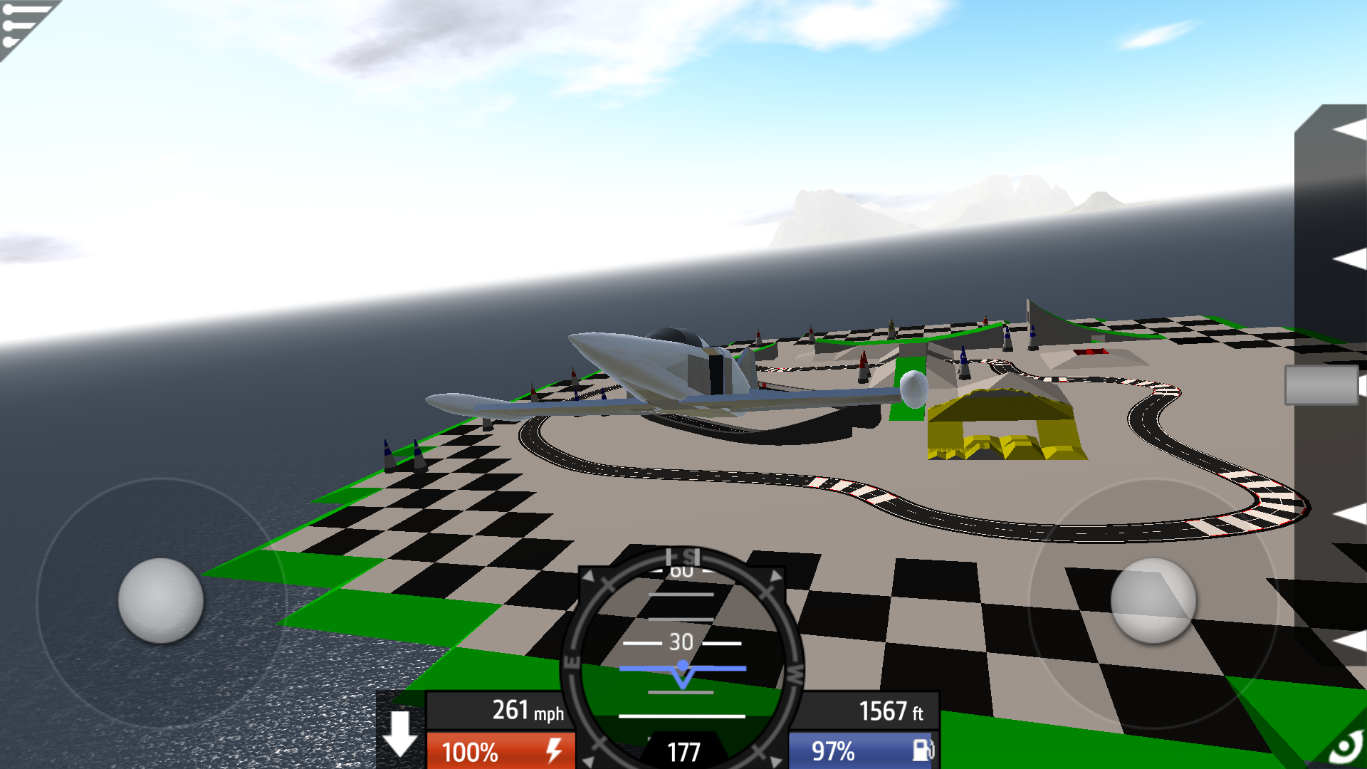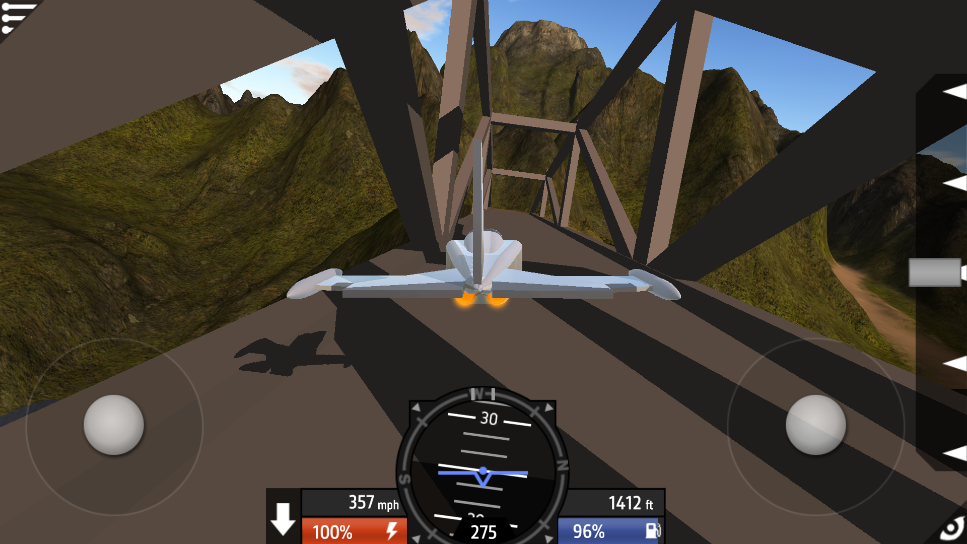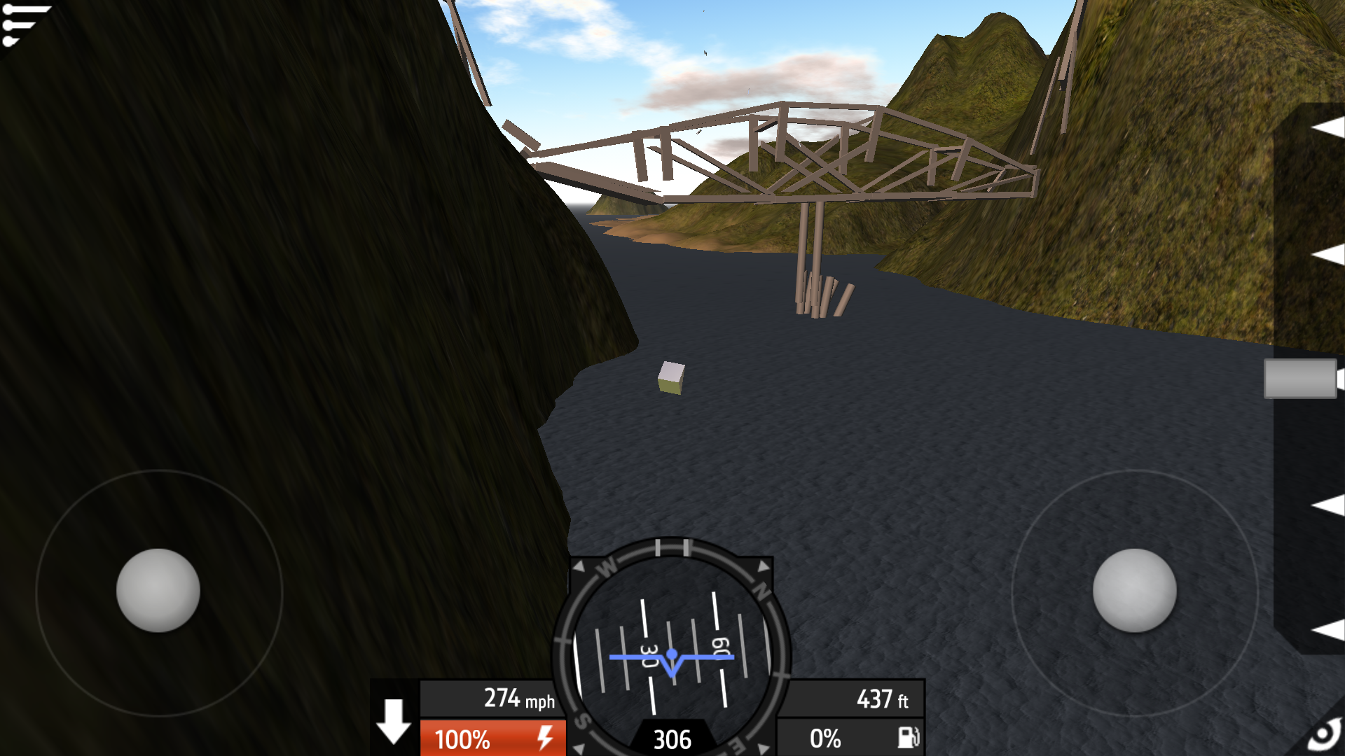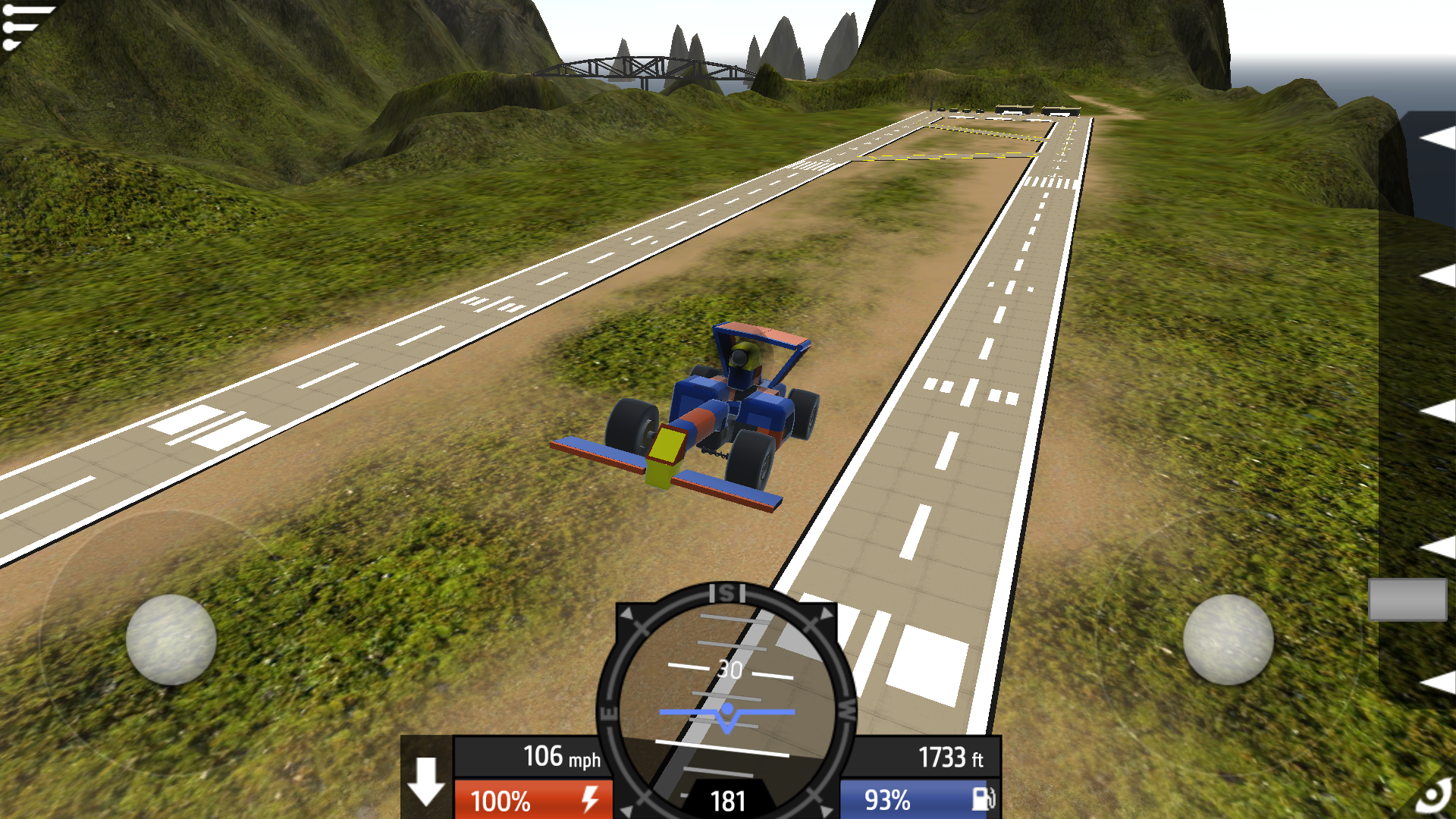 The flight Simulator is definitely not the best, but its totally OK to simulate faults in your design, like a tail heavy plane or damage. The damage simulation is really good, the plane reacts to it in a realistic way, and there can also happen stuff like burning engines and fuel tanks or propellers sticking somewhere in the plane because they fell off. In the game, your planes also can stall and get into a spin. The simulation of water is not that good in the phone version, but it's OK to take off from the water. There is also a wind simulation and lots of space to fly in. There are four Islands in the phone version and six on the PC version, and you can fly from to the other by crossing the ocean, which is great fun. The Islands have different runways and special things like aircraft carriers or bridges. It's great fun to try to fly through them or to just crash into them, because the bridges are one of the few things that can be destroyed: